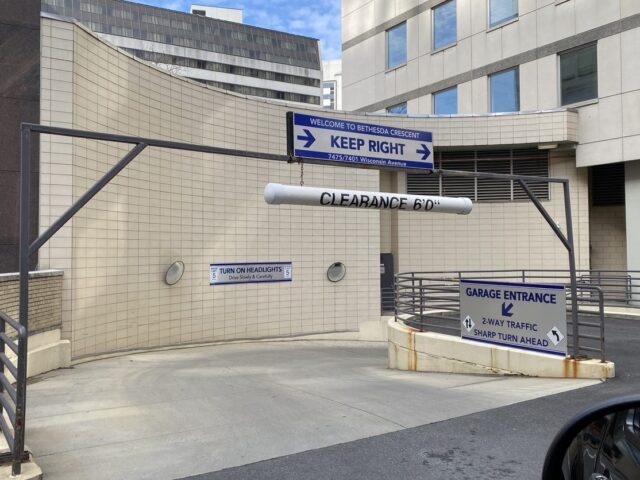 The 7475 Wisconsin Avenue garage entrance is located off of Montgomery Avenue. Montgomery Avenue is a one way street so in order to access the garage entrance you must travel on Wisconsin Avenue and then turn onto Montgomery Avenue.